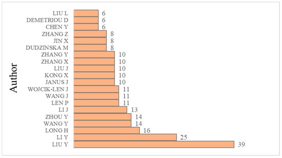 A total of 1715 authors published articles on land consolidation and rural revitalization from 1950 to 2021. Among them, Liu Yansui, Li Yurui, and Long Hualou were the most productive ones (Figure 3) with 39, 25, and 16 papers, respectively. The h-index is not only a tool to measure the importance, significance, and impact of the authors’ cumulative research contributions, but it can also be used to assess the current number of publications and predict an author’s future performance as it combines productivity with impact. In this field, Liu Yansui from China, who published the most papers, had an h-index of 18, ranking first (Table 1), indicating that the publications of this author were of high quality and greatly impacted this research field. Both Liu Yansui and Long Hualou started their research in 2009. Liu’s most cited paper was published in 2018 and Long’s in 2014 (Figure 4).