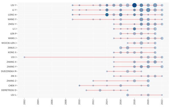 This section analyzes the number of publications and citations per year of the top 20 authors in land consolidation and rural revitalization. As seen in Figure 5, the most cited paper, published by Liu Yan in 2018, received 229 citations (the darkest spot) and was titled “Strategic adjustment of land use policy under the economic transformation”, published in LAND USE POLICY. The year 2018 is also the year with the highest number of publications in this field. Both Li Yurui’s and Long Hualou’s most cited articles were published in 2014. Whilst Li Yurui published most articles in 2020, Long Hualou had the highest number of publications in 2016.