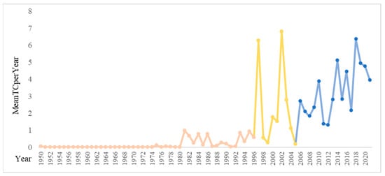 Average number of citations per year in land consolidation and rural revitalization from 1950 to 2021.