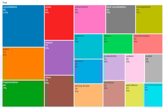 Keywords summarize the topics and contents of research at a high level. High-frequency keyword analysis directly indicates the hot spots in any research field. The word tree of the top 20 keywords in the field of land consolidation (Figure 7) was drawn using Bibliometrix. Based on the results, land consolidation, policies, and fragmentation were the most frequent keywords, indicating that land fragmentation is the main issue in the field of land consolidation, and policy measures play a key role in solving this issue. Among the keywords, “China” appeared 50 times, ranking 5th, indicating that China is one of the main regions in terms of research in land consolidation and rural revitalization. This is in line with the total publication number and the international cooperation of China analyzed above. The keywords “influence” and “driving factors” appeared 38 and 36 times, respectively.