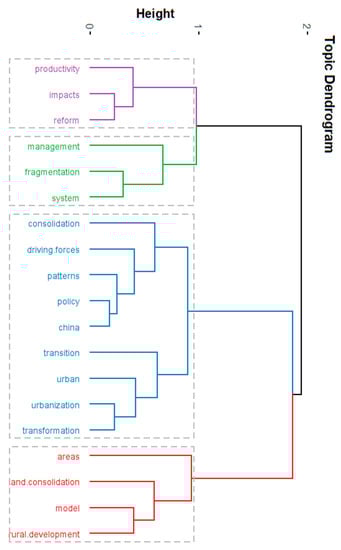 Clustering analysis is an important visual analysis in bibliometrics. Its principle is based on the frequency of two keywords appearing at the same time, and the complex keyword network relationship is simplified into several small groups by statistical methods. The main purpose of clustering analysis is to classify clusters based on similar keywords and to minimize the similarity between clusters. In this study, keyword cluster analysis in the Bibliometrix software package was used to classify and analyze multiple keywords, with the aim to cluster keywords with high similarity to the same cluster. Finally, all individuals were grouped into one category, and the similarity of keywords in the research fields of land consolidation and rural revitalization is shown in the form of a tree diagram (Figure 8).
