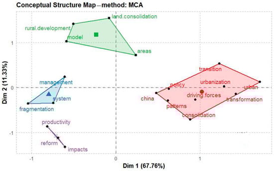 Multiple correspondence analysis of high−frequency keywords in land consolidation and rural revitalization from 1950 to 2021.