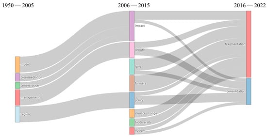 According to Figure 8, the topics of land consolidation and rural revitalization largely changed during the period from 1950 to 2021, and we analyzed the topic changes with time nodes of 2006 and 2015. From 1950 to 2021, the theme in the field of land consolidation showed four evolution paths (Figure 10).