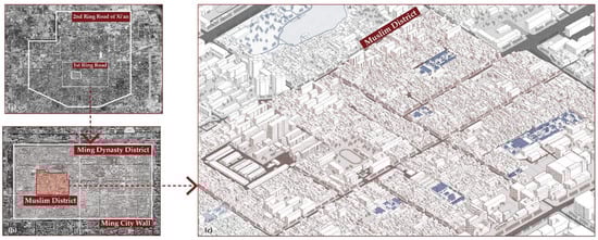 Study area (a) the DTMD in Xi’an. (b) the DTMD in the Ming Dynasty District. (c) Perspective of the DTMD.