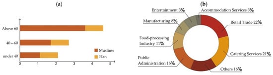 (a) Proportion of Muslims and Han populations in different age groups. (b) Occupation composition of the DTMD residents.