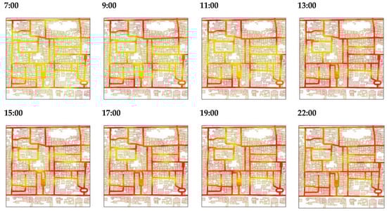 The aggregation of street vitality can be visualized through the Baidu Heat Map at hourly intervals from 7:00 to 22:00 across the DTMD (Figure 3). The time- and place-based population density change can be tracked by the change of colors, where red represents high density, and yellow represents low density.