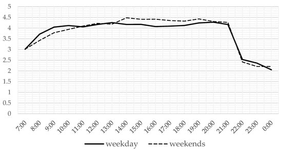 The analysis indicates the temporal and spatial characteristics of the street vitality in the DTMD. Figure 4 shows the temporal fluctuation characteristics of street vitality from 7 p.m. to 12 a.m. (one-hour slices) on weekdays and weekends, respectively. The fluctuating pattern of street vitality is in line with the movements of daily life. Multiple instantaneous vitality peaks occur at different times throughout the day on weekdays. The first peak of street vitality on weekdays appeared at 10 a.m., in line with the rapid gathering of people during the morning rush hours. Subsequently, leisure and commercial activities in the DTMD gradually become active towards early afternoon, which leads to the second peak at around 13:00, staying at a high level during the entire afternoon period. Shaped by the evening rush and nightlife activities, another peak appears around 20:00, followed by a rapid decline after 21:00 in street dynamics as the crowds gather and disperse. The changing trend of vitality on weekdays can be described as the “slow rise—smooth fluctuation—rapid decline” pattern. The fluctuation on weekends is roughly similar to that of weekdays, while, the change of street vitality on weekends is more moderate, and the peak value occurs later on weekends and lasts longer at night. The vitality value on weekends is significantly higher than that on weekdays, and weekends have slightly higher peaks compared with that of weekdays between 14:00 and 18:00.