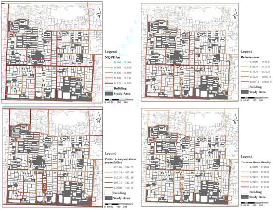 The results of closeness and betweenness exhibit the characteristics of spreading from major streets to lower-level streets. The closeness of the major streets is relatively high, reflecting the higher potential of the street to attract people arriving. The results of betweenness exhibit the cross-shaped characteristics. The road in the center presents the highest potentials of “through-movements”, showing the higher potential of the street to be selected by pedestrians or drivers as the path. Public transportation accessibility describes the nearest distance to the bus or the subway station. The periphery of the DTMD presents a higher level of accessibility to public transportation. Intersection density is measured by the number of intersections per unit area of the street network, reflecting its connectivity. The average density of intersections in the DTMD is one intersection/200–300 m, with an overall homogeneous distribution.