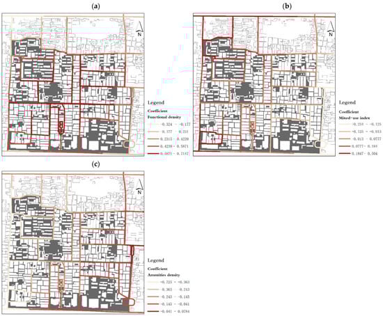 Spatial characteristics of estimated coefficients of diversity indicators with GWR. (a) Functional density; (b) Mixed-use index; (c) Amenities density.