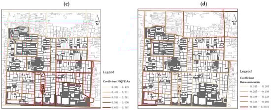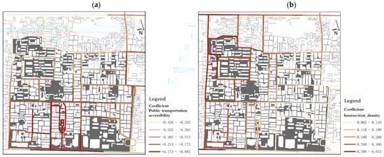 Among the independent variables of accessibility, the closeness and the public transportation accessibility have a more significant impact on vitality, as shown in Figure 8. To be specific, a remarkable positive effect of closeness is detected in the central and southeast areas of the DTMD (Figure 8c). For public transportation accessibility, the spatial characteristics of the correlation coefficients are higher in the central-southern areas (Figure 8a). The results indicate that the distance to the public transportation in this region make more of a contribution to street vitality. As to intersection density, a strong positive effect can be observed in the Northwest corner of study area (Figure 8b). In terms of betweenness, a slight negative effect can be found in most of the study regions.