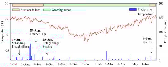 This experiment was conducted in the wheat research base of Shanxi Agricultural University, which is located in Shangyuan Village (111°43′ E, 35°39′ N), Hougong Township, Wenxi County, Yuncheng City, Shanxi Province, in the eastern part of the Loess Plateau (Figure 1). It has a typical warm–temperate sub-humid continental monsoon climate, with an average annual temperature of 12.5 °C, an average sunshine duration of 2242 h, and an average annual precipitation of 506 mm. The frost-free period is approximately 190 days. Approximately 60% to 70% of the precipitation is concentrated from July to September during the summer fallow season. Before the experiment was set up, the contents of sand, silt, and clay in the 0–0.2 m soil layer were 16.13%, 54.25%, and 29.62%, respectively. The predominant soil at the experimental site is classified as Calcaric Cambisols. Its basic nutrients were found to be organic matter 8.8 g·kg−1, alkali-hydrolyzed nitrogen 61.31 mg·kg−1, available phosphorus 10.4 mg·kg−1, and available potassium 114.0 mg·kg−1. The pH value was 8.44. Winter wheat summer fallow is the main cropping system in the dryland in the region. In general, the growth season of winter wheat ranges from late September to early June, and no crops are planted the rest of the year. In this study, the local temperature and precipitation distribution from July 2020 to June 2021 are shown in Figure 2.