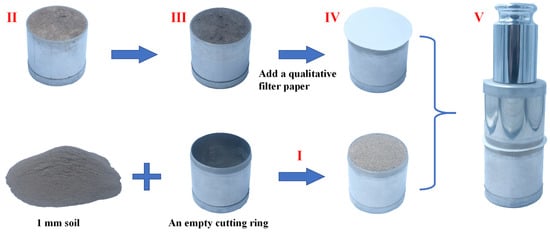 Soil porosity was measured by the cutting-ring method []. A cutting ring of 100 cm3 (diameter 5.05 cm, height 5.00 cm) was used to collect the undisturbed soil in the 0–0.3 m profile. At the same time, the additional soil in the same nearby layer was taken into a valve bag, 140 g of which was loaded into a 100 cm3 empty cutting ring after air-drying and passing through a 1 mm sieve (Figure 3I). The cutting ring with the undisturbed soil sample was brought back to the laboratory, and the soil outside the cutting ring was wiped. After removing the top nonporous lid, the cutting ring with the undisturbed soil covered with the bottom mash lid (Figure 3II) was placed into a plastic box (height 0.1 m) covered with gauze. Then, water was slowly added from the edge of the plastic box to a level slightly lower than the upper surface of the cutting ring, so that the undisturbed soil was fully saturated with water (Figure 3III). The top nonporous lip was covered on the cutting ring with the water-saturated undisturbed soil sample, the bottom mash lid was removed, and a layer of qualitative filter paper was immediately attached to the bottom (Figure 3IV) and placed on the cutting ring with the soil. The edges of the two cutting rings were neatly placed together and compacted with an approximately 2 kg weight to put them into close contact (Figure 3V). After the gravity water was completely discharged, the weight of the cutting ring with the undisturbed soil sample was measured and recorded as M1. After that, the cutting ring with the undisturbed soil sample was placed in an electrothermal blow-drying oven at 105 °C to dry it to a constant weight, which was recorded as M2. Finally, the undisturbed soil within the cutting ring was removed and wiped clean, and the weight of the empty cutting ring was recorded as M0. Based on the above data, Pt, Pa, and Pc were calculated using Equations (1), (3) and (5), respectively, by Zou et al. [].