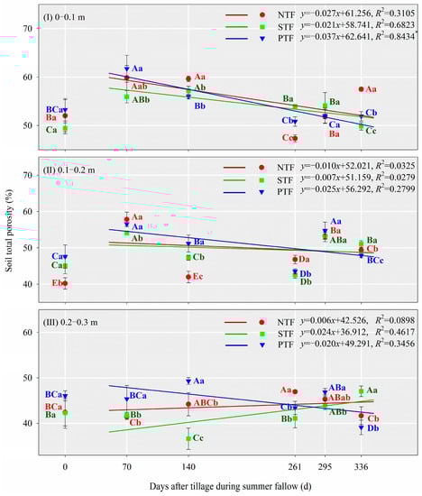 Effects of tillage during summer fallow on soil total porosity in the examined dryland wheat field. NTF is no tillage during summer fallow, STF is subsoiling during summer fallow, and PTF is plough tillage during summer fallow. The lowercase letters in the same column indicate significant differences among those treatments at p < 0.05. The capital letters with the same color indicate significant differences among different sampling times at p < 0.05. * indicate the significant at p < 0.05.
