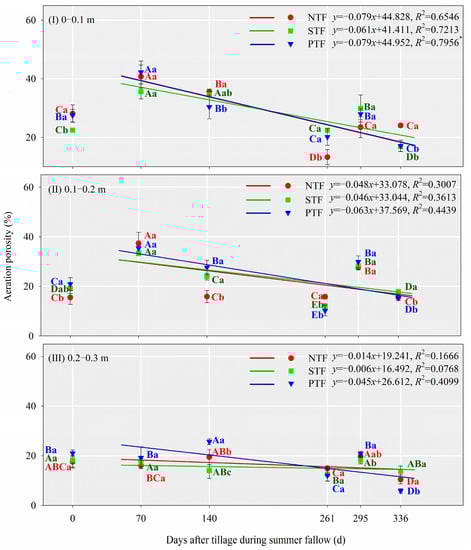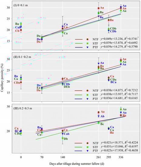 Generally, tillage can loosen soil and increase soil total and aeration porosity [,]. The results showed that Pt and Pa increased significantly, and Pc decreased significantly in the 0–0.2 m soil profile before the sowing of winter wheat compared with their respective values before tillage during summer fallow. This was mainly due to deep plough under the PTF treatment and loosening under the STF treatment at the end of July and rotary tillage for all treatments at the end of August in the current study. Although the tillage intensity was different under different treatments, the soil pore structure was strongly damaged under all treatments, and Pt and Pa were significantly increased. In addition, with the implementation of rotary tillage at the end of August, the straw stubble of winter wheat was buried in the tilled zone. Then, straw decomposition could promote the formation of porosity [,]. However, with the passage of time, Pt and Pa of the 0–0.2 m soil profile under all treatments gradually decreased, while Pc gradually increased. This might be due to soil subsidence under gravity and the strike of precipitation, resulting in a gradual compact arrangement of the soil particles.