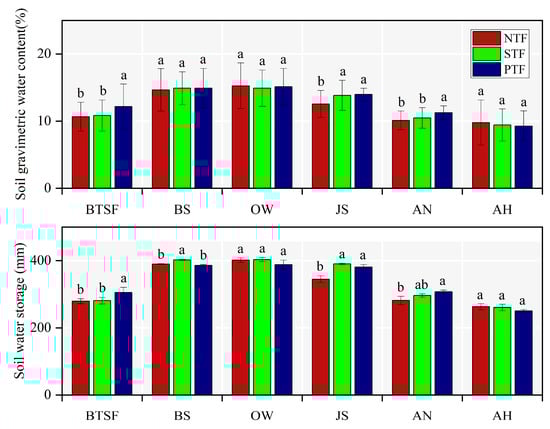 Effects of tillage during summer fallow on soil gravimetric water content and soil water storage in the dryland wheat field. The lowercase letters indicate significant differences among those treatments at p < 0.05. BTSF indicates the sampling time before tillage during summer fallow. BS indicates the sampling time before the sowing of winter wheat. OW indicates the sampling time at the overwintering stage. JS indicates the sampling time at the jointing stage. AN indicates the sampling time at the anthesis stage. AH indicates the sampling time after the harvest of winter wheat.