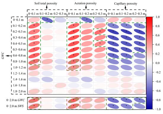 Correlation between soil porosity and soil moisture. GWC indicates the soil gravimetric water content, and SWS indicates the soil water storage. * indicate the significant at p < 0.05.