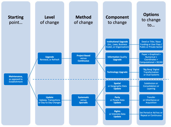 The concept of maintenance encompasses the updating of a land administration system with changes to people-to-land relationships (e.g., transactions), or the upgrading of data quality within the land information system in terms of accuracy of content, or the broader renewal of its underpinning IT infrastructure [6,7]. Whilst there exists a significant amount of literature on approaches to improve maintenance, e.g., [4,8,9] problems continue to persist in practice, e.g., [10].