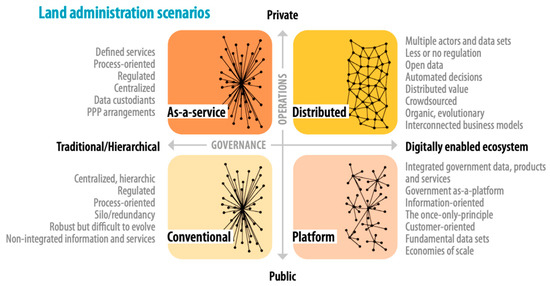 Land administration as-a-Service: one of 4 future scenarios for organising land administration, as defined by UNECE WPLA. (Source: [11]—from Scenario Study on Future Land Administration in the UNECE Region, by UNECE, ©2021 United Nations. Reprinted with the permission of the United Nations).