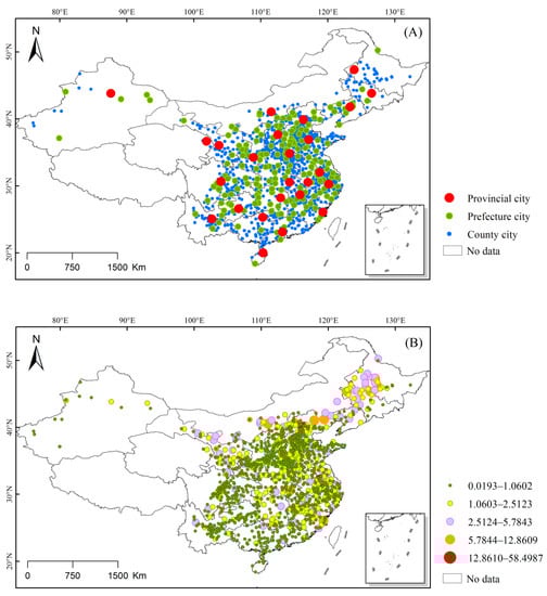 - A total of 1265 county level or above cities were counted in the TCE, including 25 provincial level or above cities, 179 prefectural level cities, and 1061 county level cities. Based on the extent of the city walls in TCE, the largest city was Beijing, with an area of 58.5 km2, and the smallest city was Jinghe in Xinjiang, with an area of 0.02 km2. The total land area of all of the cities was 1396.48 km2, with a mean value of 1.1 km2 and a standard deviation of 2.37 km2.