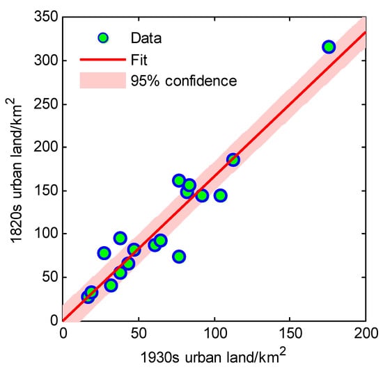- Large-scale military topographic maps of historical periods have proven to be a good source for land use reconstruction. Uncertainty analysis showed that the military topographic maps for the 1930s have good accuracy, and the correlation coefficient between the reconstructed urban areas based on topographic maps and the area values obtained using remote sensing images was 0.976. The 1° × 1° gridded urban land area dataset constructed based on a GIS model of the TCE is important for future research on historical LUCC and can provide basic data for climate change models, urban economic history, and other disciplines.