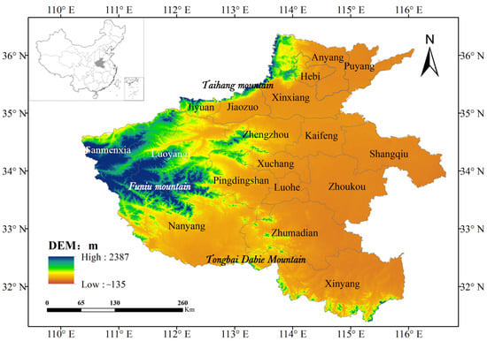Henan Province is located in central China, bounded by longitudes 110°21′–116°39′ East and latitudes 31°23′–36°22′ North. From south to north, Henan Province straddles the natural boundary between the warm temperate and subtropical zones [], with two types of monsoon climate. The climate of Henan Province is characterized by hot and rainy periods, with high temperatures and relatively abundant precipitation in the summer and low precipitation in the winter. Temperatures are milder in parts of southern Henan and colder in the north–central region, with minimum temperatures below 0 °C.