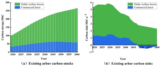 This paper illustrates the vegetation carbon sequestration of existing arbor forests in Henan Province in two parts. The existing arbor forests refer to the arbor forests already planted in Henan Province at the time of the 9th forest inventory. To clearly depict the vegetative carbon content of an existing arbor forest, this section has been divided into two parts. The first part presents the vegetation carbon sink of public welfare forests and commercial forests in existing tree forests in Henan Province. The second part describes the carbon stocks of six dominant tree species in Henan Province. In particular, it should be noted that the carbon stock of the six dominant species simulated in this paper does not represent the total vegetation carbon stock of the entire arbor forest in Henan Province. Therefore, this paper divided the total vegetation carbon stock of the six dominant tree species by their share in the total arbor forest volume (85.53%) to obtain the total vegetation carbon stock of the existing arbor forest in Henan Province, as shown in Figure 2.