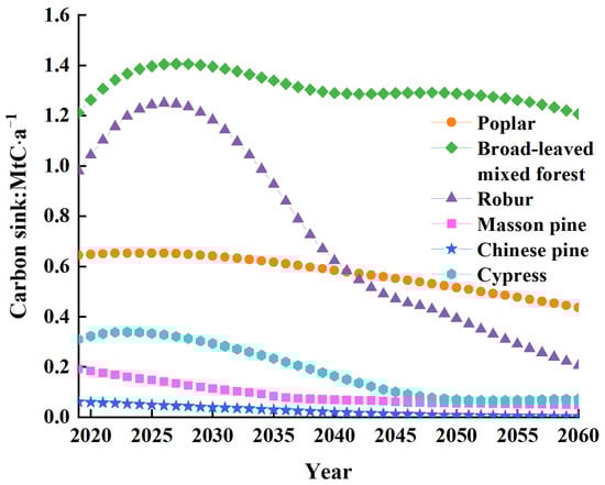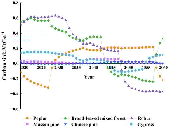 An overview of carbon sequestration in arbor forests is given above, and the description of vegetative sequestration by tree species is given below. Figure 3 displays the ability of the leading tree species in the public welfare forest of Henan Province to store carbon. As the number of years increases, the carbon-sink capacity of all existing dominant tree species in Henan Province, except Robur, tends to decrease slightly during the simulation period. The carbon sink capacity of the dominant tree species in Henan Province is closely correlated with their carbon density and area before and after tree maturity. The dominant species’ carbon density increases quickly during the young and middle stages of the trees’ development, slowing down after maturity, which is consistent with the findings of previous studies [,]. The dominant tree species, broad-leaved mixed forest, Robur, and cypress, have a relatively large area of medium and low forest age, greater than 89.51% of the total area, while the remaining species have a lower percentage. This explains why these three species’ carbon stocks rise more quickly and rapidly in young and medium-sized forests and why the capacity of carbon sinks exhibits a more pronounced upward trend that is not found in the remaining species.