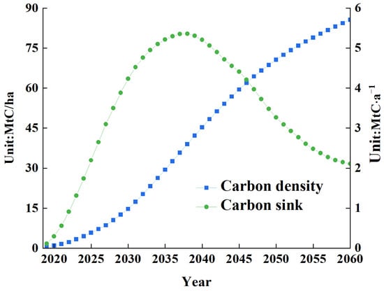 Figure 5 displays the carbon density and annual vegetation carbon sink of newly planted arbor forests in Henan Province. It can be seen in Figure 5 that the vegetation carbon density of the new afforestation has been increasing in line with the trend of carbon stock throughout the simulation period. The average annual change in the carbon density is 13.13%, ranging from 0.54 MgC/ha at the start of the simulation to 80.6 MgC/ha in 2060. The rate of increase in vegetation carbon density was slow in both the early and late stages of the simulation, but for different reasons. In the early stages, the area of newly planted trees was limited; in the later stages of the simulation, the rate of carbon sequestration slowed down when each newly planted tree was in the mature or over-mature stage. In the middle of the simulation, the afforestation plan was completed, and the forest area in Henan Province increased significantly. Meanwhile, the newly planted forests gradually grew into middle-aged forests, so the annual carbon sink of the new afforestation reached a peak of 5.36 MtC in 2038. This is the reason why the annual carbon sink of newly planted forests in Henan Province tends to increase and then decrease. These trends are consistent with the findings of previous studies on carbon stock in natural forest reserves [].