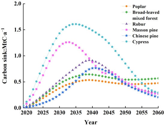 Figure 6 displays the annual vegetation carbon sinks of newly planted dominant tree species in Henan Province. The annual carbon sinks of these dominant tree species show an inverted U-shaped trend, and the peak carbon sink years of the dominant tree species in new plantations were those of trees that were young or of middle age. Cypress is the largest contributor to the carbon sink of new plantations, and Chinese pine is the lowest. According to the forest-planning objectives of Henan Province, the new forest area in each stage of forest planning was equally distributed amongst each dominant species. Therefore, the main influencing factor of carbon sink in newly planted forests is the carbon density of dominant species. Cypress has the highest carbon density of the dominant species, while poplar and Chinese pine have the lowest carbon densities, respectively. It should be noted that the carbon sink of Chinese pine and poplar changes at different growth stages of the trees. In the early stages of tree growth, the carbon density of poplar is greater than that of Chinese pine, while in the later stages, the opposite is true; this conclusion is also consistent with other scholars’ studies [,]. As shown in Figure 6, cypress and Masson pine have higher carbon sinks in the same area, while the rest of the dominant species have lower ones. The existing dominant species in Henan Province are broad-leaved mixed forest, Robur, and poplar in a large area, while cypress and Masson pine have a limited forest area. Based on the perspective of the carbon intensity of the dominant species, the planting of cypress and Masson pine should be increased in the future in order to better achieve the-carbon reduction target of Henan Province.