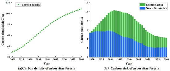 All arborvitae forests’ carbon density and carbon sink in Henan Province, 2019–2060.