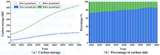The previous section illustrated the vegetation carbon sink of existing and newly planted arbor forests in Henan Province. Combining the two gives the total carbon sink of arbor forest vegetation in Henan Province from 2019 to 2060. This section describes the vegetation carbon sink of all arbor forests in Henan Province from two perspectives. Initially, the carbon stock of all arbor forests’ vegetation at various modeling stages is analyzed; finally, the carbon stock of all arbor plantations is described in two parts, above and below ground. The above-ground component includes carbon sequestered by tree trunks, leaves, branches, and forest products, while the below-ground component includes the roots of trees and carbon that sank into the soil.