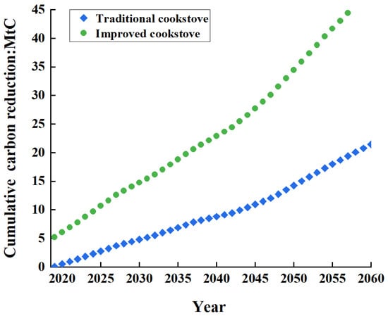 Figure 9 demonstrates the cumulative carbon emissions from the arbor forestry bioenergy at two different combustion efficiencies The carbon reduction from the improved forestry bioenergy cookstoves is more than twice that of traditional cookstoves, as reflected by average annual emission reductions of 0.53 MtC/a and 1.07 MtC/a for conventional and improved cookstoves, respectively. From 2018 to 2060, the emission-abatement effect of arboreal forest biomass in Henan Province increases, which can be divided into two phases according to the rate of increase. From 2019 to 2042, trees are in their growth phase, and very few trees are logged, which results in less forestry bioenergy being obtainable. In this situation, the cumulative emission reductions obtained from using traditional cookstoves and improved cookstoves amount to 9.77 MtC and 20.09 MtC, respectively. Between 2043 and 2060, when most of the trees enter the main harvesting period, a large amount of felling residues will be generated to be burned as fuel, and the emission reduction of forestry bioenergy will be significantly enhanced. In this situation, 11.99 MtC of carbon could be reduced by 2060 using traditional cookstove technology, and 23.88 MtC of carbon could be reduced by 2060 using improved cookstove technology with higher combustion efficiency, which increases the average annual carbon reduction for 2019–2042 by 0.24 MtC/a and 0.45 MtC/a, respectively.