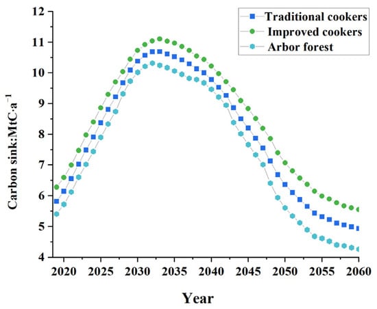 Comprehensively taking into account the sink-enhancement effect of forest vegetation and the emission reduction effect of forestry bioenergy, the entire emission-reduction scale of arboreal forest vegetation in Henan Province in 2019–2060 is shown in Figure 10. Compared with no consideration of bioenergy emission reduction, the scale of carbon reduction from vegetation sequestration in arboreal forests is slightly larger when both traditional and improved cooking technologies are used. The following are descriptions of the three scenarios: First, the replacement effect of bioenergy is not considered; the cumulative carbon sink of arbor forest vegetation in Henan Province is 313.17 MtC from 2019 to 2060, peaking at 10.32 MtC/a in 2032. Second, considering the substitution effect of traditional cookstove technology, the total carbon reduction is 334.92 MtC, peaking at 10.69 MtC/a in 2033, while bioenergy accounts for 6.5% of the cumulative carbon sink. Finally, after considering the substitution effect of improved cookstove technology, the total carbon reduction is 357.14 MtC, peaking at 11.11 MtC/a in 2033, while bioenergy accounts for 12.31% of the cumulative carbon sink. Based on the above three contexts, it seems that to achieve the ‘double carbon target’ as early as possible, the forestry sector in Henan Province should pay attention to the use of forestry bioenergy, especially commercial forest bioenergy. In addition, the efficiency of bioenergy utilization should be improved to further enhance the carbon sequestration potential of the forestry sector.