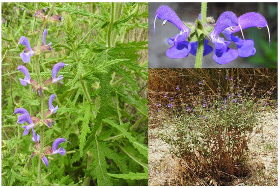 Lamiaceae, one of the largest families of angiosperms, includes more than 7000 species distributed throughout the world, with several species characterised by essential oils [54,55,56,57,58]. In the Italian flora, among the endemic species of this family with an extremely limited range [59,60], whose existence may be threatened in the near future by climate change, there is Salvia ceratophylloides Ard. (Figure 1), a species growing exclusively in southern Italy in the hill belt of the suburb of Reggio Calabria. It is clearly distinguished from the other perennial sage species of the Salvia pratensis L. group, to which it belongs [61,62], mainly by its wrinkled, pinnatifid leaves with toothed lobes [63,64]. Its chromosome number is 2n = 6x = 54 [65]. Salvia ceratophylloides (Figure 1) is a perennial herbaceous plant (scapose hemicryptophyte), densely pubescent with both glandular and simple patent hairs, has a main flowering period in spring from April to June, and has a second flowering period in autumn from October to November. Pollination is entomophilous, mediated mainly by hymenoptera (Eucera sp., Bombus sp., Apis sp.). The fruiting occurs after some flowering weeks. Seed dispersal is mainly carried out by ants (myrmecochory) [64]. Seed germination takes place mostly in spring, seedlings reach reproductive maturity (small generative) within 4–5 months, while they tiller (Large Generative) in the following year [13].