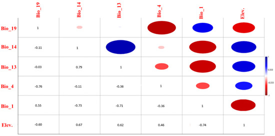 Pearson’s [88] correlation analysis made it possible to determine six ecological variables (out of 22) useful for modelling the distribution of the species. Five bioclimatic variables (Bio 1, Bio 4, Bio 13, Bio 14, Bio 19) and one topographic variable (Elev.) were found to be significant (−0.8 ≤ r ≤ +0.8) (Table 1, Figure 2). These variables were also used for modelling the future scenarios. Variables with values >0.8 and those <−0.8 were not considered in order to avoid overfitting.
