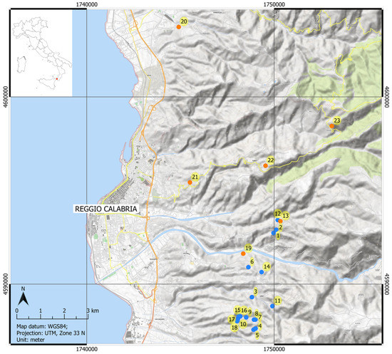 Occurrence points of Salvia ceratophylloides Ard. In blue are the micro-populations currently occurring, in orange the extinct ones. 1—Serro Ciugna, Mosorrofa; 2—Serro Ciugna, Mosorrofa; 3—Spilingari, Armo; 4—Contrada S. Todaro, Aretina; 5—Contrada S. Todaro, Aretina; 6—Serro dei Morti, Puzzi fraz. di Gallina; 7—Prai, Aretina; 8—Prai, Aretina; 9—Aretina; 10—Aretina; 11—Grotta di S. Arsenio, Armo; 12—Mosorrofa vecchio; 13—Mosorrofa vecchio; 14—Serro d’Angelo, Puzzi fraz. of Gallina; 15—Prai, Aretina; 16—Prai, Aretina; 17—Serro della Cattina, Aretina; 18—Serro della Cattina, Aretina; 19—Lutrà, Fiumara di Sant’Agata; 20—Galluzzi, Gallico Superiore; 21—Pietra Storta; 22—Croce Missionaria, Terreti; 23—Fontana Acqua Fresca, Straorino. In the top left-hand corner, the distribution area of the points of occurrence is highlighted in red.