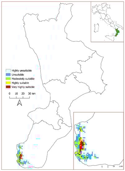 In accordance with the CORINE Land Cover system [98], class 2 (agricultural areas) and class 3 (forests and semi-natural areas) were considered in relation to the actual occurrence of the species; the second class was also considered because the Calabrian territory has fragmented agricultural areas that form a complex cultivation mosaic with the forests and semi-natural areas. All other land-use classes were omitted from the analyses.