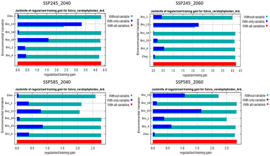 The jackknife test (Figure 6) reveals that the distribution of S. ceratophylloides with SSP 245 over the 2021–2040 period is mainly influenced by the precipitation of the wettest month (Bio 13) with 86.3%, an annual mean temperature (Bio 1) with 7%, and a temperature seasonality (Bio 4) with 5.5%; the remaining variables contributing a total of 1.2%. Regarding the importance of permutation, the most influential variable is Bio 13 with 97.8%. With SSP 245 in the 20-year period between 2041–2060, the variables that contribute the most are the precipitation of the wettest month (Bio 13) with 73.4%, the temperature seasonality (Bio 4) with 12.1%, and the annual mean temperature (Bio 1) with 11.9%; the remaining variables contribute a total of 2.6%.