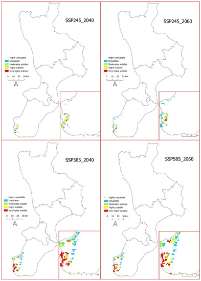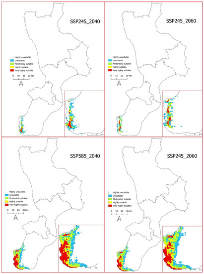 Further analyses of the current model suggest that the distribution of the species is strongly influenced by the same climatic conditions reported earlier in the literature [13,64]. The temperature and humidity variables that condition the reproductive biology of the species [13] proved important in defining the species’ current potential distribution pattern. In particular, the average annual temperature parameters limit the distribution (7.8%) of this typically thermophilus species, as do the humidity parameters (precipitation of wettest month, precipitation of driest month, precipitation of coldest quarter) and temperature seasonality, which are closely linked to the species’ ecological needs for germination and the release of young seedlings [13,64,80,81,82]. The elevation variable also has a range that does not differ from elevations measured at actual occurrence points [13,64]. The current potential distribution model includes (with a probability value of very highly suitable occurrence ≥0.80) areas where the species occurs as well as those where it is extinct [70,71]. Therefore, the extinction of the species in the latter areas is the result of severe environmental changes in the suburban area of Reggio Calabria, which is subject to extensive urbanisation and frequent devastating fires [99]. Future model projections for 2021–2040 and 2041–2060, obtained from the SSP245 and SSP585 scenarios, indicate that climate change will significantly influence the distribution of this species. The models with the SSP585 scenario show more significant impacts than the SSP245 scenario, which considers the same bioclimatic characteristics currently in place [19]. The SSP585 scenario shows that, the range suitable for the species will increase by 167% in the 2021–2040 period and 171% in the 2041–2060 period (Table 3, Figure 7). This trend can also be seen in other similar studies [100,101]. Furthermore, the SSP585 scenario predicts an extension of the optimal range to lower altitudes, down to sea level, and other authors also point to an altitudinal shift in the current potential distribution area of the examined species [43].