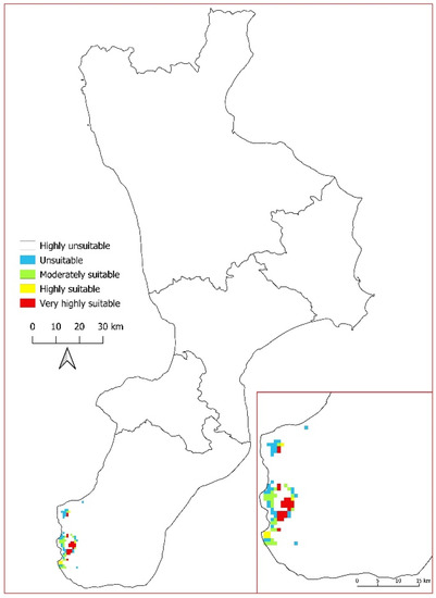 Interpolating the current distribution model and the land use map shows that the area suitable for the species corresponds to 183.295 km2, i.e., 1.22% of the entire regional territory; relating this to the current potential distribution model shows a decrease in the area suitable for the species of 54.026 km2, i.e., 23% less (Table 5, Figure 10). The interpolation of the current distribution model with the exclusion of areas where there is no geological substrate suitable for the growth of the species, shows that the entire distribution area is 41.392 km2, or 0.28%, of the entire regional territory, and in relation to the current potential distribution model, the area undergoes a decrease of 83%, or 195.929 km2 (Figure 10). The table also shows the measures and percentages relating to the classification of habitat suitability in relation to the probability of occurrence values (Table 5).