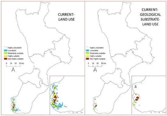 Prediction of the current potential distribution of Salvia ceratophylloides Ard. Only in relation to land use and land use with geological substrate. In white, highly unsuitable (≤0.20); in blue, unsuitable (0.21–0.40); in green, moderately suitable (0.41–0.60); in yellow, highly suitable (0.61–0.80); and in red, very highly suitable (≥0.80).