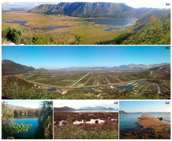 Neretva delta landscape (a) Kuti lake, (b) trenches landscape pattern, (c) reeds by the river, (d) Mediterranean fines of high sieves, (e) sandbanks at the mouth of the river Neretva.