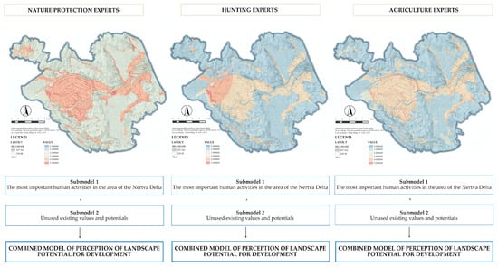 The first model, the model of the perception of natural qualities, was obtained by overlapping and summarizing sub-model 1—characteristic natural value, sub-model 2—the most significant locations in the context of naturalness, sub-model 3—basic characteristics of areas with prominent naturalness and sub-model 4—pressures and loads affecting the naturalness of the area, for each group of experts separately (Figure 3). Second model, the model of perception of landscape potential for development was obtained by overlapping and summarizing sub-model 5—the most significant human activity in the area of the Neretva Delta and sub-model 6—existing values and potentials of space that have not been used so far (Figure 4).