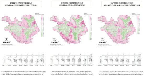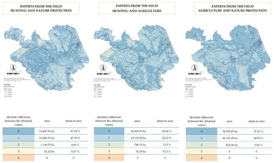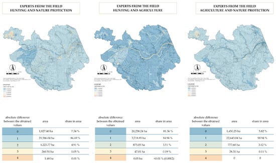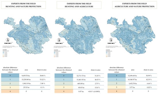 The results of the cross-tabulation analysis of cartographic representations (see maps and tables in Figure 8) and the differences between the combined models of the perception of natural qualities and landscape potential for development (see maps and tables in Figure 9) indicate that the absolute difference 0 in the perception of natural qualities and landscape potential for development between groups of experts in the field of hunting and agriculture and between experts in the field of agriculture and nature protection appears on about 50% of the surface, except between groups of experts in the field of hunting and nature protection where 38.80% of the surface has an absolute difference of 0, i.e., it is perceived as equally valuable. Analogously, the absolute difference 1 between all experts is around 50%. As already mentioned, although small, it still represents a difference in value perception and should not be ignored.