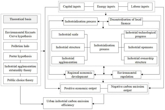In summary, this paper presents a comprehensive analysis of the factors which influence industrial carbon emission efficiency in cities from 11 aspects, including the level of economic development, industrialization, environmental regulation, fiscal decentralization, and other urban development factors, as well as industrial enterprise scale, industrial structure, industrial technical advancement, industrial openness, industrial concentration, industrial diversification, industrial property structure, and other industrial characteristic factors (Figure 1).