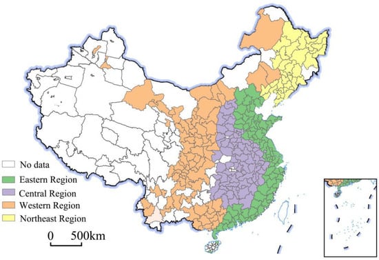 282 cities in mainland China were selected as the study objects (excluding cities in Hong Kong, Macao, Taiwan, and cities in self-increased autonomous regions due to data availability restrictions). Since China’s reform and opening-up, the Chinese government has successively put forward regional development strategies such as the pioneering development of the east, the development of the west, the revitalization of the northeast, and the rise of central China to promote the pioneering and coordinated development of the region. Each region has different levels of development due to its regional location, resource endowment, and policy conditions. In order to explore the evolutionary mechanism of industrial carbon emission efficiency under different development levels, this paper divides China into: eastern region, central region, western region, and northeastern region (Figure 2).
