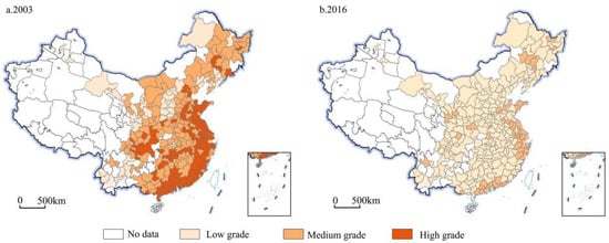 Using the ArcGIS natural breakpoint method, UICEs in 2003 and 2016 were divided into high, medium, and low categories (Figure 3). For the purpose of this study, low efficiency ranged from 0 to 0.3, medium efficiency ranged from 0.3 to 0.7, and high efficiency ranged from 0.7 to 1. In 2003. China’s UICE was dominated by low efficiency, with 221 cities with low efficiency, accounting for 78.37% of the total number of cities. During this period, China’s industrialization level was generally quite low, and most cities were at the primary stage of industrialization, with crude industrial production, low technology level, and obvious resource and energy factor-driven characteristics. The number of medium- and high-efficiency cities with UICE was relatively small, with Sanya City, as the only high-efficiency city, and 60 medium-efficiency cities, accounting for 21.28% of the number of cities nationwide, mainly distributed in the eastern coastal region, including most cities in Jiangsu Province, Hangzhou, Ningbo, Wenzhou, Shaoxing, Zhoushan, Taizhou, Jiaxing, and Lishui in Zhejiang Province, most cities in Guangdong Province, Xiamen and Shanghai in Fujian Province, and a few in Western regions, such as Dingxi in Gansu Province, Guyuan in Ningxia Hui Autonomous Prefecture, Bazhong in Sichuan Province, Lijiang in Yunnan Province, Fangchenggang in Guangxi Province, etc.