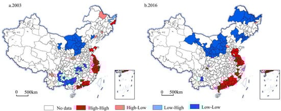 According to the global autocorrelation analysis, the global Moran’s I values for 2003 and 2016 were 0.4643 and 0.6667, respectively, passing the significance level test (p = 0.03). This indicates that UICE has significant favourable spatial correlation properties, and the spatial correlation tends to increase. According to the local spatial autocorrelation analysis, cities with significant spatial agglomeration effects were classified into four types (Figure 4). Among them, the high-high type, i.e., the UICE high-value agglomeration area, is concentrated in the middle and lower reaches of the Yangtze River plain area. The number of cities contained in the area shows an increasing trend. The region has a developed economy, high level of industrial technology, and high level of industrial carbon emission efficiency, showing an obvious spatial agglomeration effect. The low-low type, i.e., UICE low-value agglomeration area, is concentrated in the cities of the Yunnan-Guizhou Plateau and the Loess Plateau region in the western region, and the number of cities in the western region shows an increasing trend. Industrial development in the region is dominated by traditional industries, with high energy consumption and pollution as the main characteristics, driven by industrial transfer and the spatial proximity effect, showing a low-value agglomeration state. The number of cities in both low-high and high-low agglomerations is low.