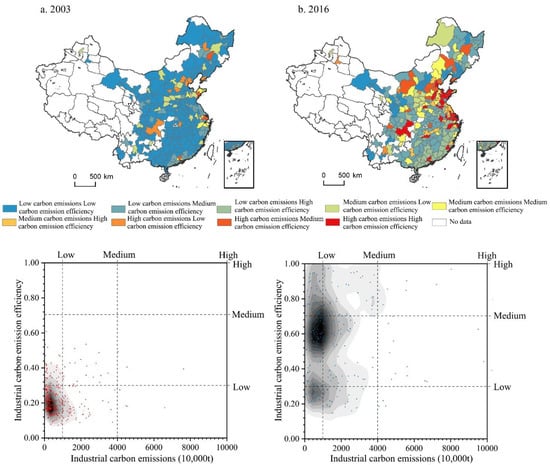 Using the natural breakpoint method, the industrial carbon emissions and industrial carbon efficiency of Chinese cities in 2003 and 2016 were divided into three types: low, medium, and high, and nine types were formed by the combination of two kinds.
