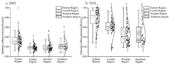 We plotted a box line of UICE for each region in China. In 2003, the average value of UICE in the eastern region was higher than that of other regions, while the differences among other regions were not significant. The overall level of UICE was low. The UICE distribution within each region was relatively concentrated and basically normally distributed. It was indicated that UICE in China was at an initial low level of stability at the beginning of the study (Figure 6a). UICE improved across all regions in 2016. Regional differences increased, with the eastern region reaching high efficiency levels overall, with the central and western regions, as well as the northeastern region, being moderately efficient. The normal distribution of each region is broken, and the distribution curve of UICE becomes flat. The distribution curves of the eastern and central regions form a “trailing effect,” indicating that, while the UICE of most cities in these two regions has increased, the industrial carbon efficiency of a small number of cities is still at a low level; the distribution curves of the western and northeastern regions form a “leading effect,” with the UICE of a small number of cities at a high level. However, most cities are still at a low level of industrial carbon efficiency (Figure 6b). It can be seen that UICE, in 2016, has not yet reached a new steady state in all regions and is still in the process of evolving towards a high-efficiency steady state.